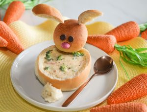 Combine 2 dinner rolls into a ball (or use 1 Texas roll). With a sharp knife, cut each roll into 4 slices and slightly flatten each slice after cutting.